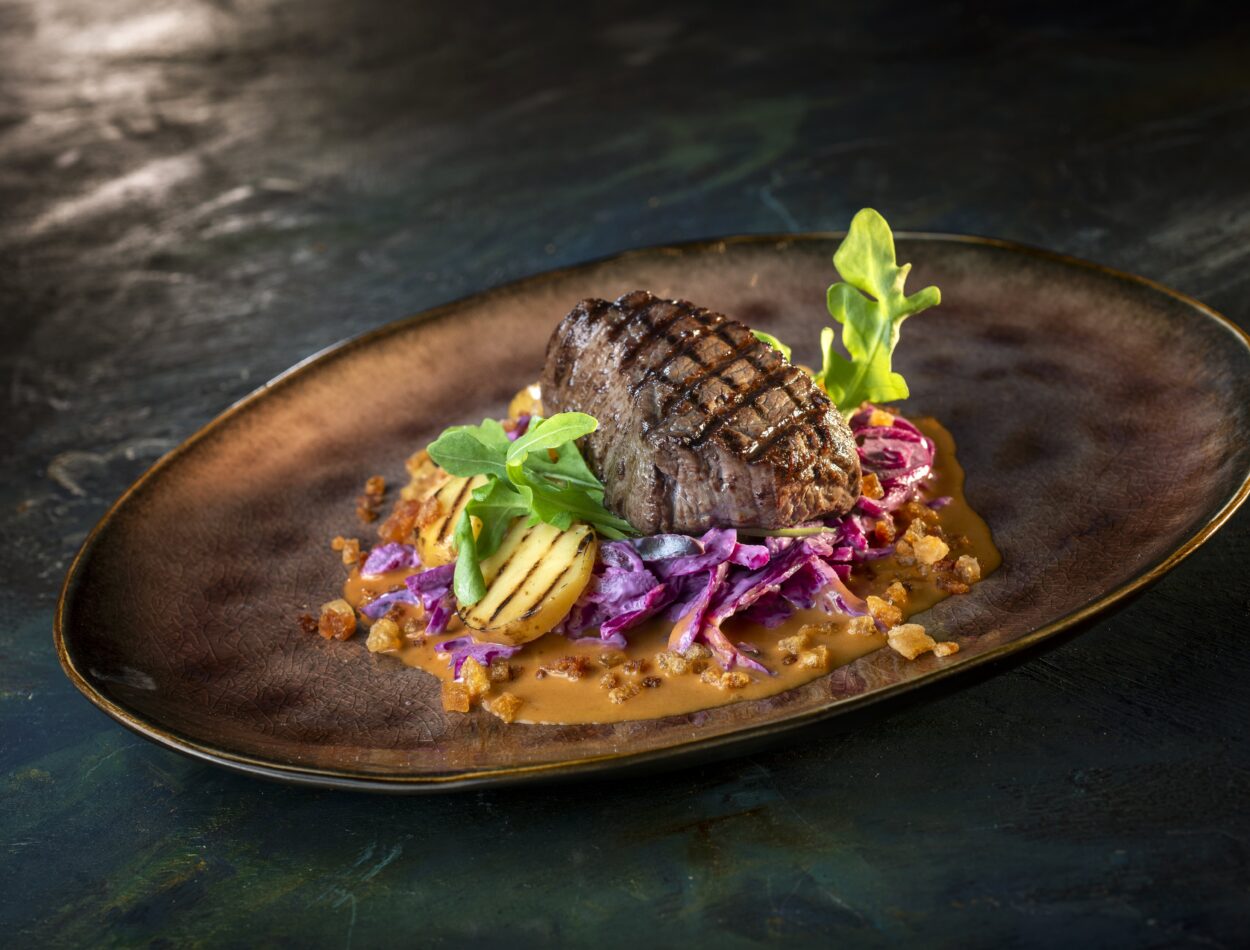 Dun gesneden hertenrugfilet met een dressing van truffelmayonaise, geroosterde hazelnoten en winterpostelein. Elegant en licht, ideaal om de maaltijd mee te starten.