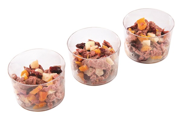 Salade van geplukt hertenvlees, appelblokjes, perzikblokjes, mayonaise en honing, in een disposable.