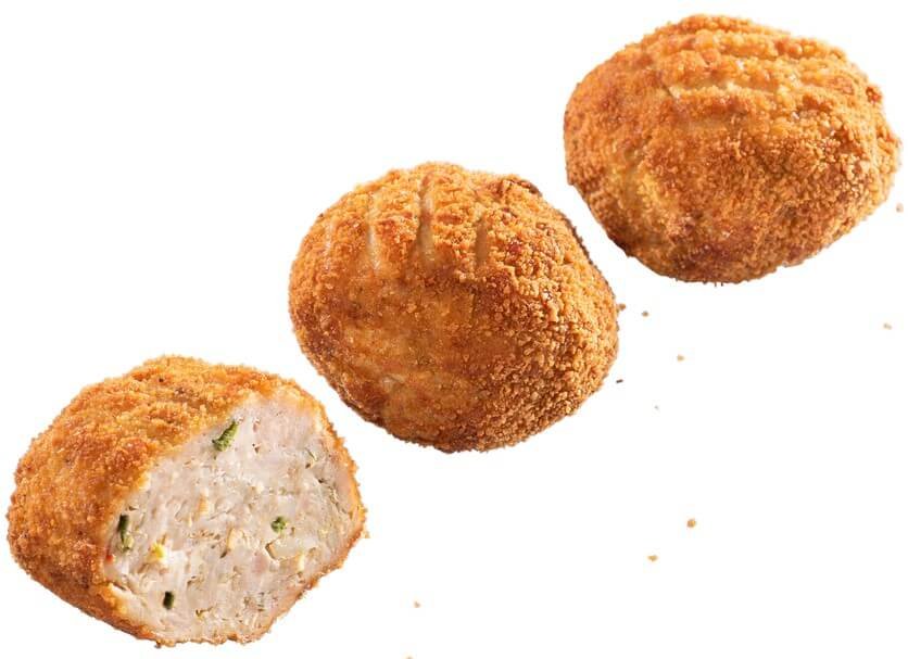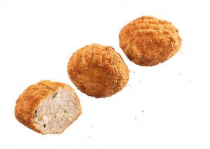 Gehaktbal van mager kipgehakt met verse groenten, afgepaneerd en gegaard.
