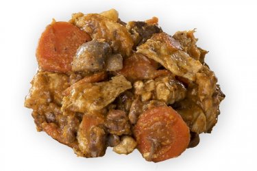 Kipdijfilet in een rodewijnsaus met champignons, zilveruitjes en wortel.