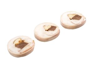 Amuse van hoenderdijfilet met hertensukade, gedroogde stukjes appel en speculaaskruiden.
