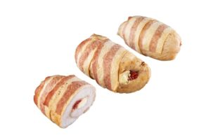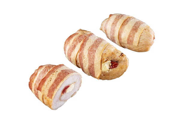 Kalkoenfilet gevuld met zongedroogde tomaat en roomkaas, omwikkeld met kalkoenspek.