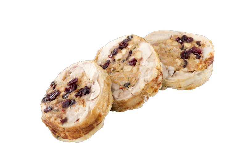 Kalkoenfilet met een heerlijke farce van cranberry en verse kruiden, tot rollade verwerkt in braadfolie, geportioneerd.