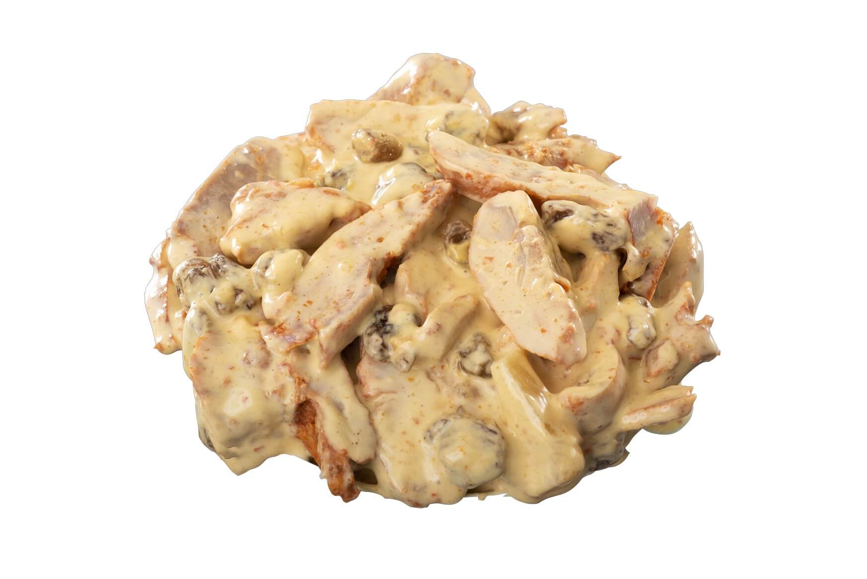 Kipdijfiletblokjes in kerriesaus met ananas, paprika en rozijnen.