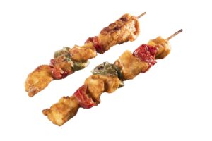 Ambachtelijke shaslick gemaakt van kipfilet, afgewisseld met paprika, rookspek en ui.