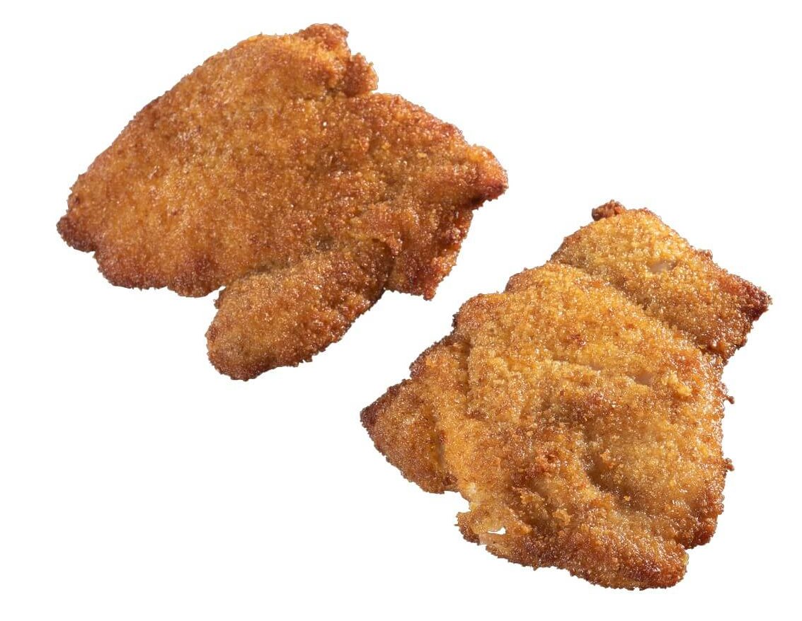 Kipdijfilet, geplet, gekruid, licht gezouten en afgepaneerd met paneermeel, gegaard.
