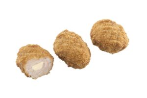 Kipgehakt gevuld met ham en kaas, gepaneerd en gegaard.