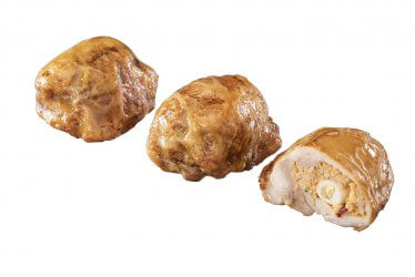 Uitgebeende poularde met een vulling van farce en ei, gegaard.