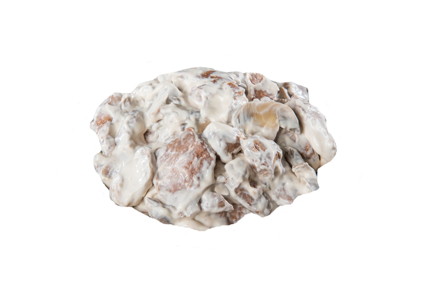 Malse varkenshaaspuntjes, champignons en roomsaus.