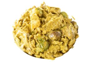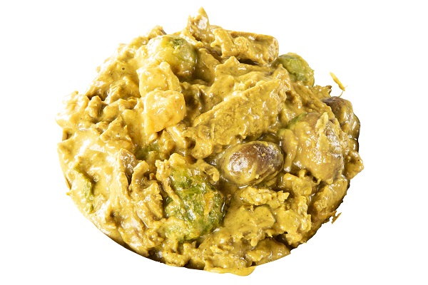 Een winters stoofpotje met vegetarische reepjes, pompoen, spruitjes en paddenstoelen.